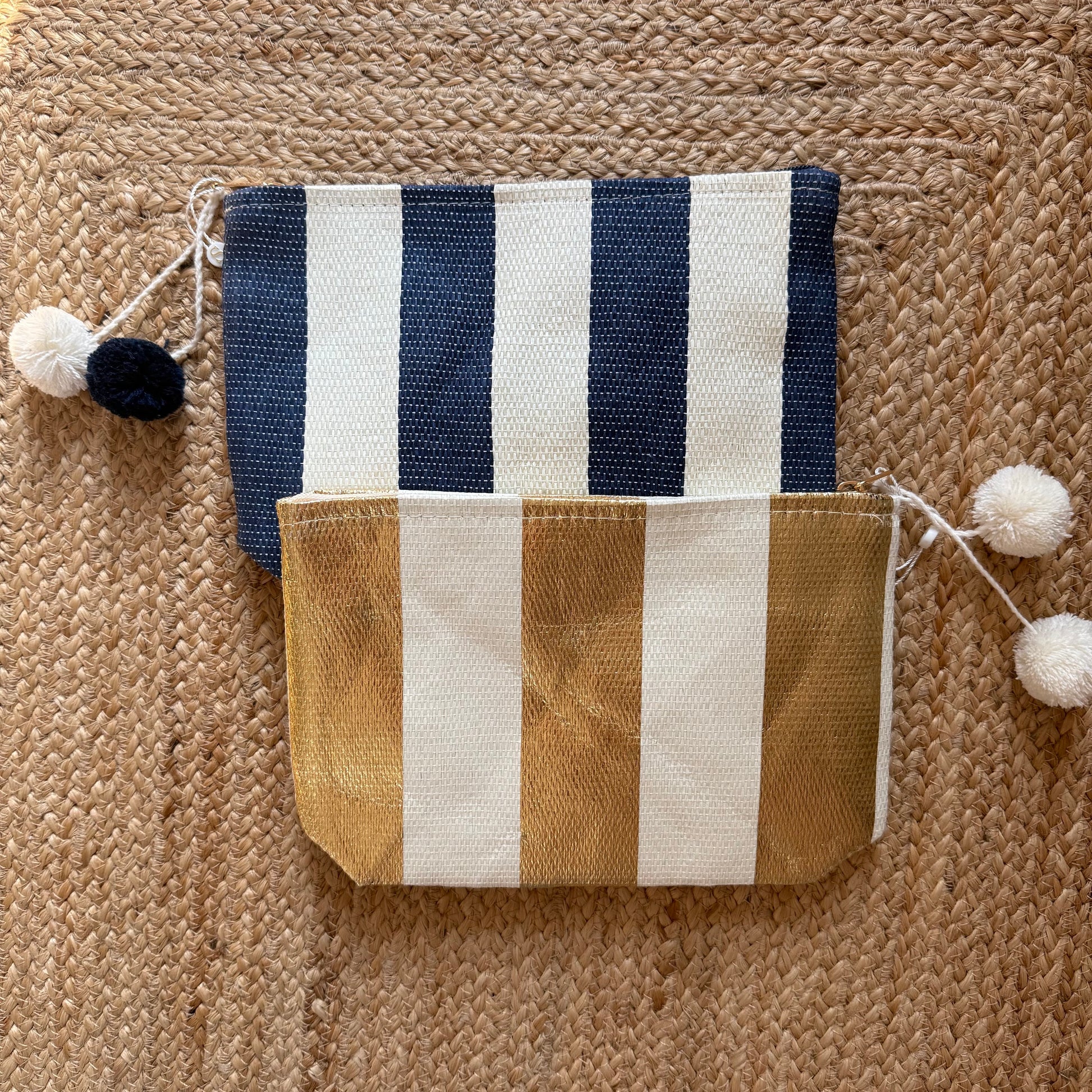 Featuring bold stripes in eye-catching hues, this pouch is crafted from durable woven material with chic tassel details. Its spacious interior keeps all your essentials organized – whether it’s sunscreen at the beach or lip gloss for a night out.